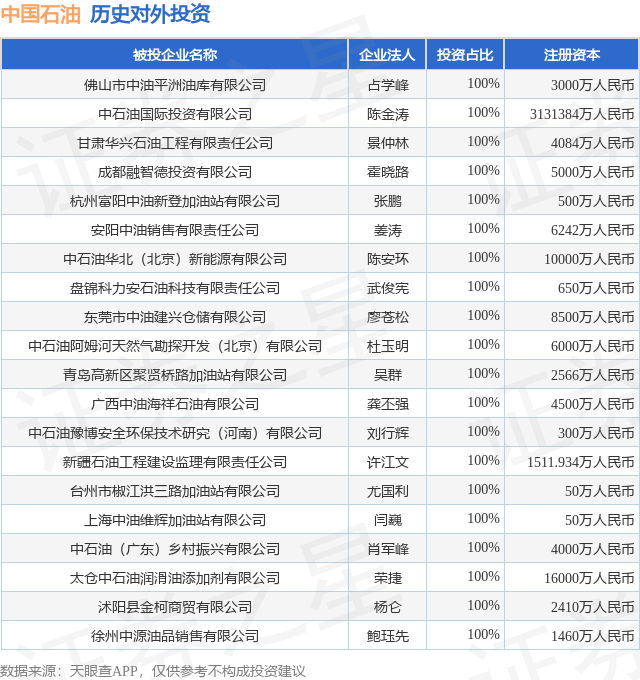 本站消息,根据天眼查APP显示,中国石油(601857.SH)新增一起对外投资事件申宝配资,被投资公司为中油上海销售有限公司,法定代表人李海生申宝配资,投资占比为89%。该公司从事批发业,注册资本为10000万人民币。目前,中国石油共存在对外投资1068项,投资占比前20的项目见下表: